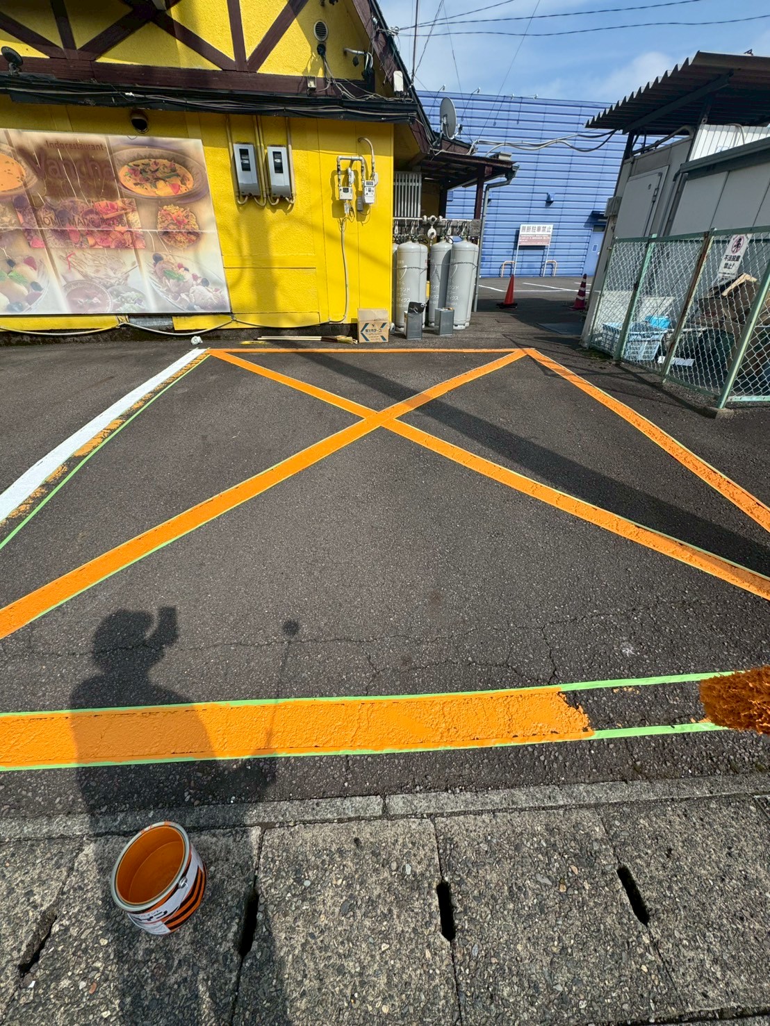 今回の施工では、ガスボンベなどが設置されている設備前に、オレンジ色の×印も施しました。