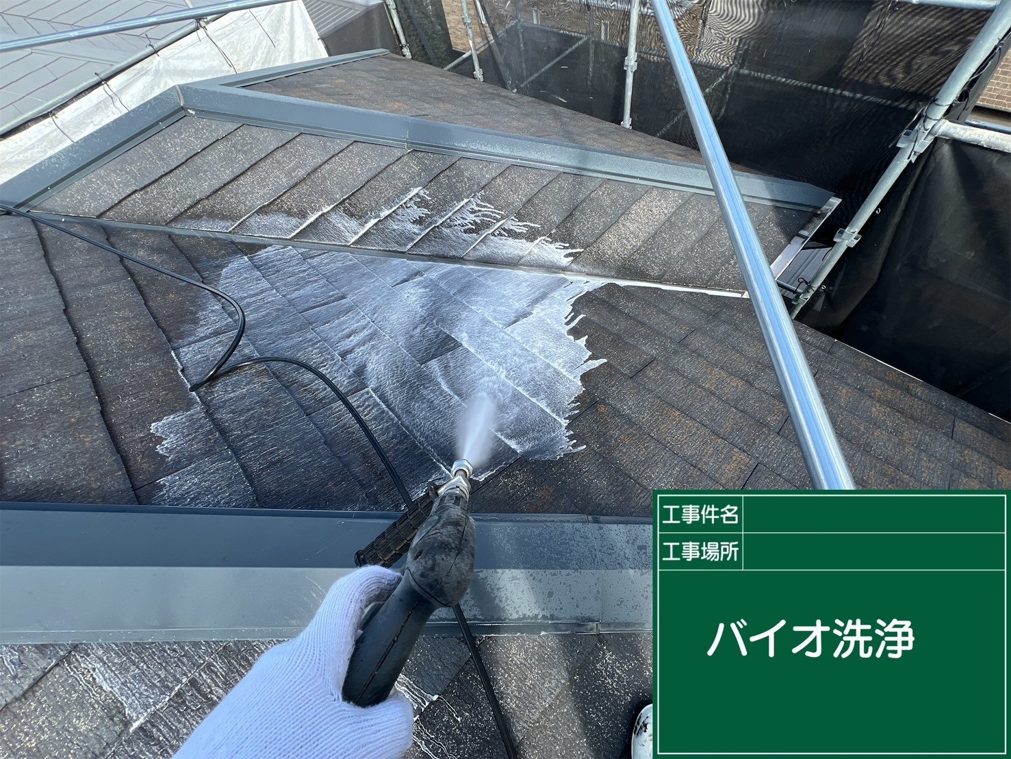 屋根表面に付着したコケ・藻・ホコリを除去します。高圧洗浄を使うケースも多いですが、塗膜を傷めないよう注意が必要です。また、雨樋・集水器・軒先などもゴミ・落葉で詰まりやすいため清掃が必要です。