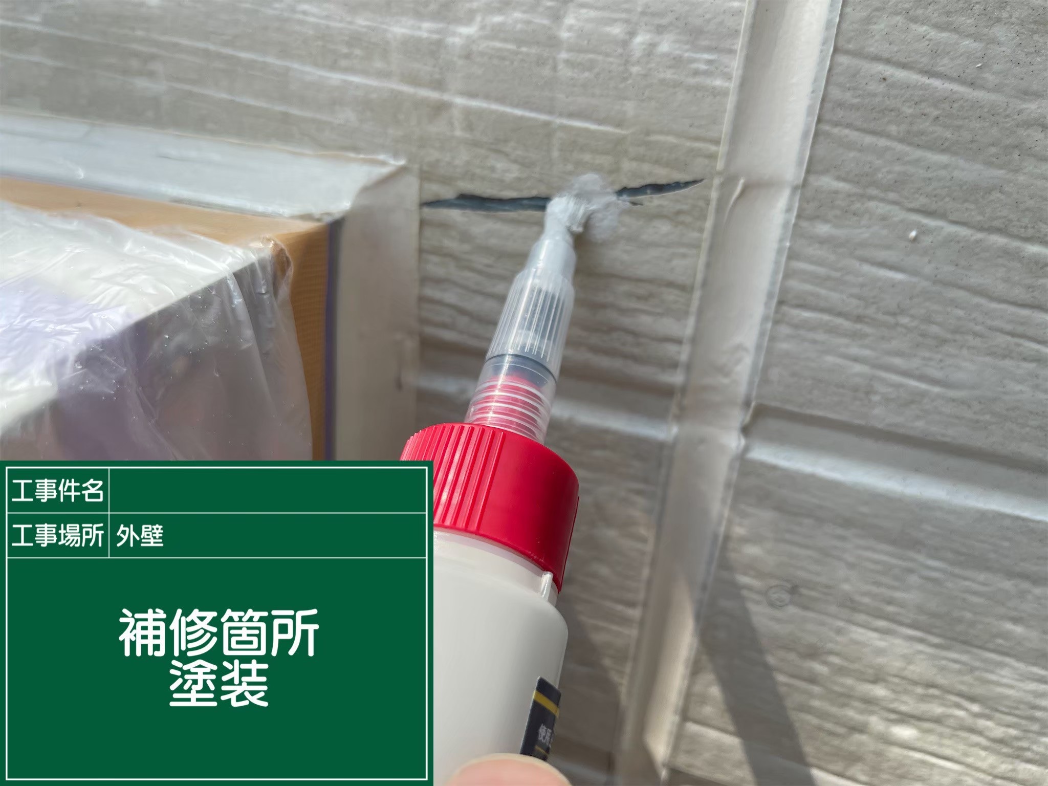補修には「ドライフレックス」という高性能な補修材を使用し、外壁色に合わせた仕上げ塗装とクリア塗装まで丁寧に施工しました。
