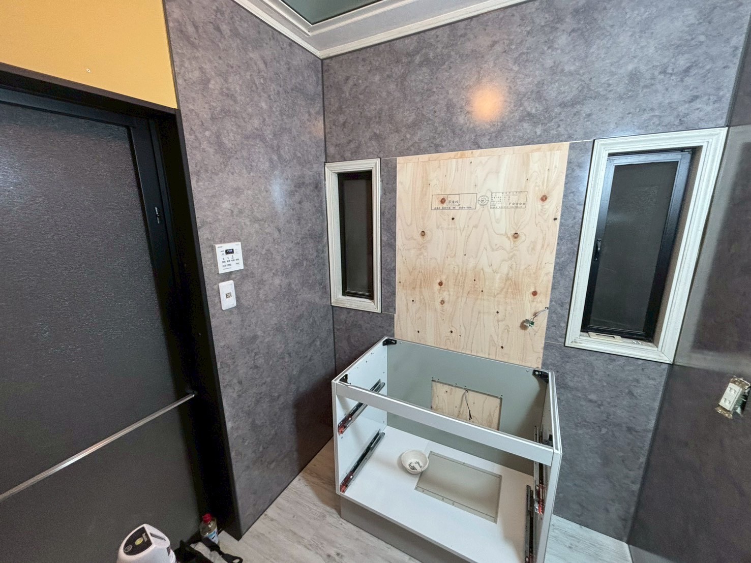 既存の洗面台の内部にはカビが見られ、撤去すると 壁の下地が露出している状態 でした。