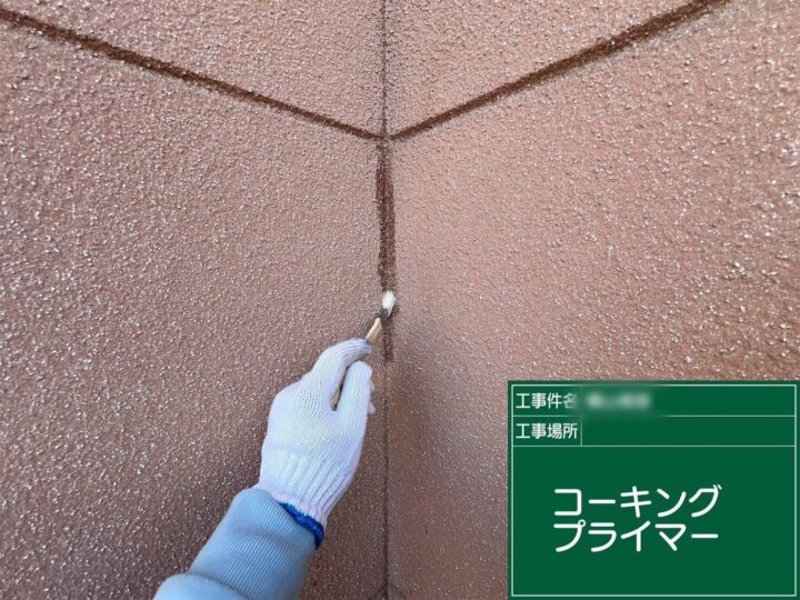 プライマーは外壁とシーリング材のくっつきをよくするための密着材です。シーリング打設する前に満遍なくプライマーを塗布していきます。