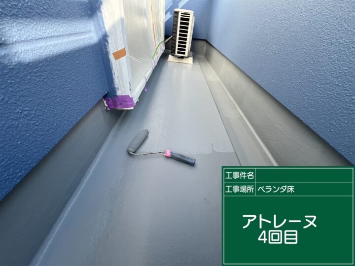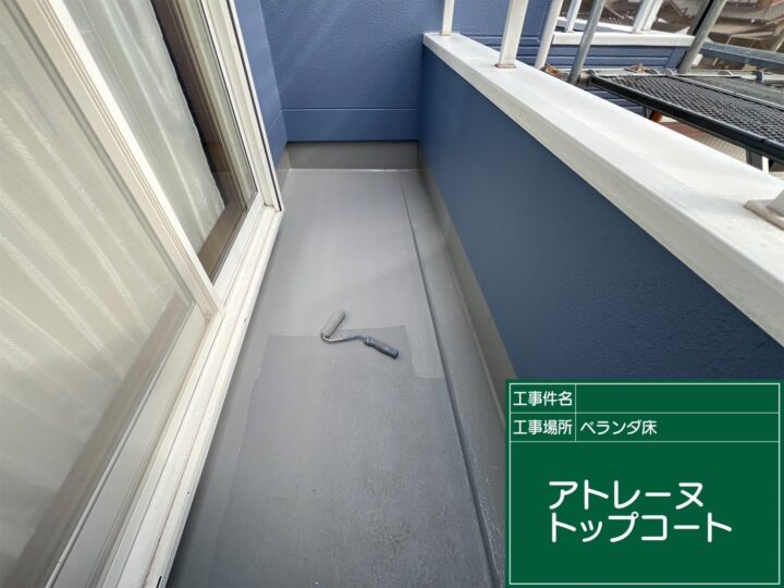 トップコートとして機能し、最終的な塗装となるため、塗り残しがないように均一に塗布することが重要です。トップコートは耐候性に優れ、アトレーヌ水性防水材の防水層を保護し、仕上げの美観を向上させます。塗布後は完全に乾燥させ、仕上がりを確認します。
