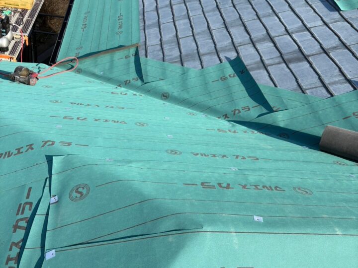 ルーフィング(防水紙)を敷設し、雨の侵入を防ぎます。万が一、屋根材の下に水分が入り込んでも守ってくれます。