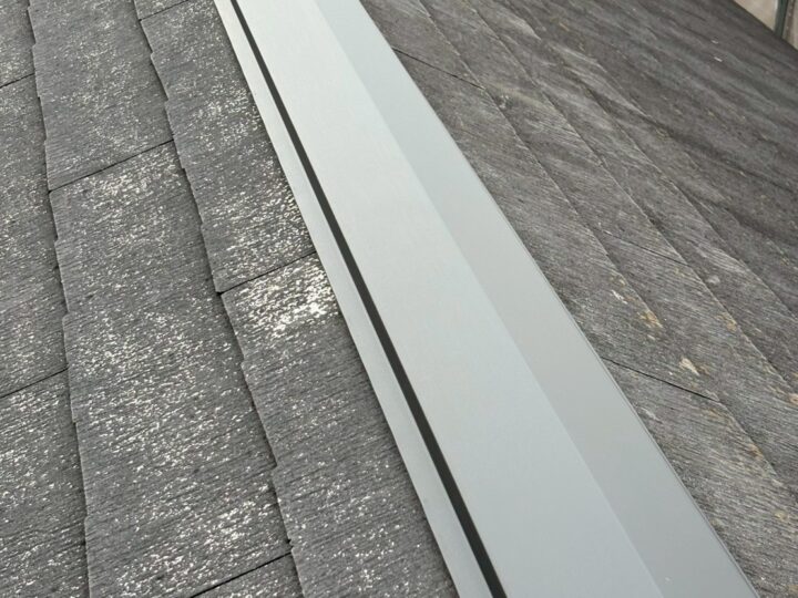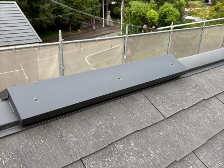 棟板金とは、屋根の頂点にある板金のことです。屋根と屋根の面が合わさる部分を覆って雨水が侵入するのを防ぎます。