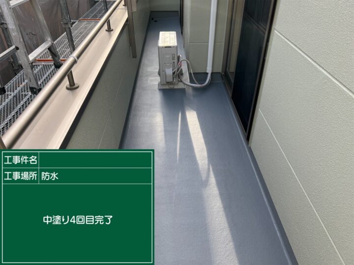 防水の塗料との密着た良くなるようにプライマーを塗り、防水塗装の上塗りを重ねて行うことで塗膜に十分な厚みができます。
