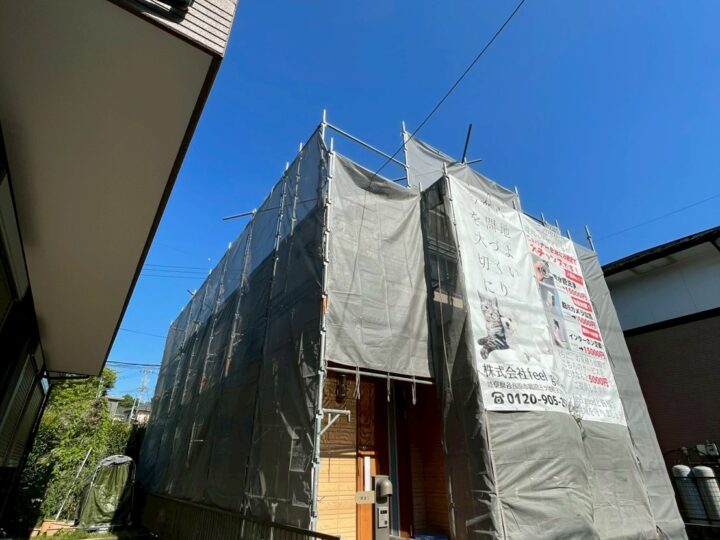 いよいよ始まる作業の開始となります。足場を組み立て、ネット養生します。足場を立てる前にご近所様へのご挨拶は弊社の方で行わせていただきます。