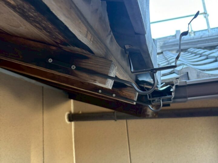 新しい雨樋をしっかり支えるため、金具を一から設置しました。勾配(こうばい)をしっかり調整し、雨水がスムーズに流れるように丁寧に取り付けています。