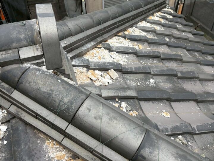 劣化した屋根の漆喰は、表面だけでなく内部まで傷んでいることが多いため、既存の漆喰をしっかりと掘り出して撤去しました。